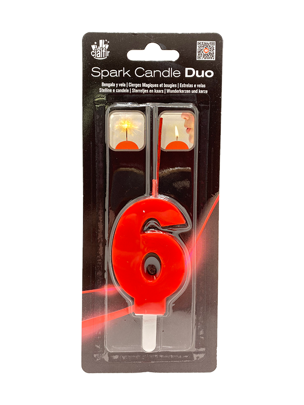 Espectacular e innovadora vela de color rojo que al encenderla se inicia con las chispas de una bengala y al cabo de unos segundos se transforma en una vela tradicional para soplar.