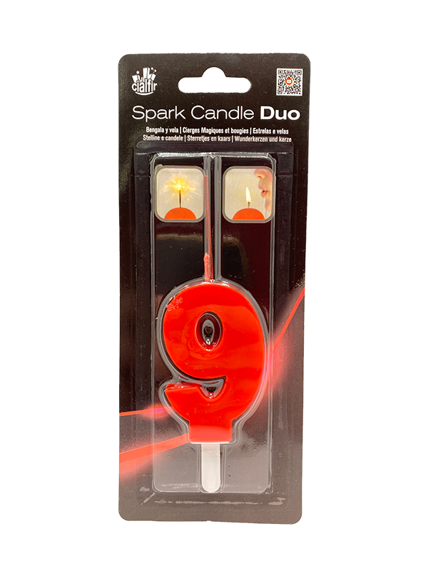 Espectacular e innovadora vela de color rojo que al encenderla se inicia con las chispas de una bengala y al cabo de unos segundos se transforma en una vela tradicional para soplar.