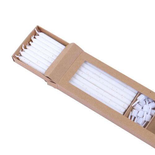 Da el toque final a tus tartas y postres con este set de velas extra largas de color blanco con purpurina